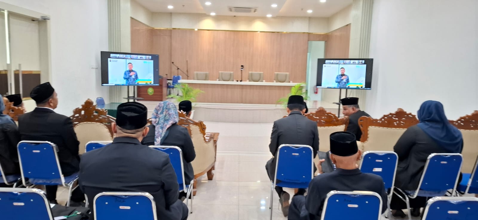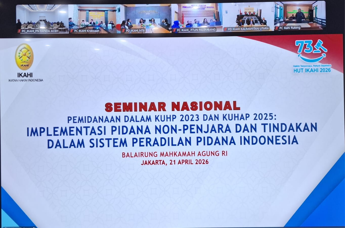 BANDA ACEH — Suasana khidmat sekaligus penuh semangat mewarnai kegiatan yang diikuti oleh para hakim Pengadilan Negeri (PN) Banda Aceh Kelas I A, Selasa (21/4/2025). Bertempat di ruang aula Pengadilan Negeri Banda Aceh yang telah dilengkapi layar daring, para hakim bersama pimpinan pengadilan mengikuti Seminar Nasional sekaligus Puncak Peringatan Hari Ulang Tahun (HUT) Ikatan Hakim Indonesia (IKAHI) ke-73 yang diselenggarakan secara virtual dari Jakarta.