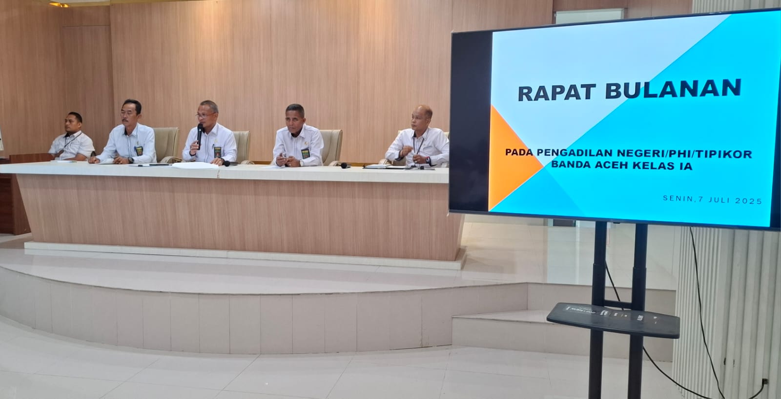 Banda Aceh – Senin (07/07/2025) Pengadilan Negeri Banda kembali menyelenggarakan rapat bulanan Juni pada hari Senin, 07 Juli 2025 bertempat di Ruang Aula Pengadilan Negeri Banda Aceh. Kegiatan ini dipimpin oleh Ketua Pengadilan Negeri Banda Aceh Bapak Dr. Teuku Syarafi, S.H.,M.H. dihadiri oleh seluruh jajaran pimpinan dan staf dari setiap Kepaniteraan dan Kesektretariatan. Rapat bulanan ini bertujuan untuk mengevaluasi pelaksanaan tugas dan fungsi selama bulan sebelumnya serta menyusun strategi peningkatan kinerja dan pelayanan kepada masyarakat pencari keadilan.